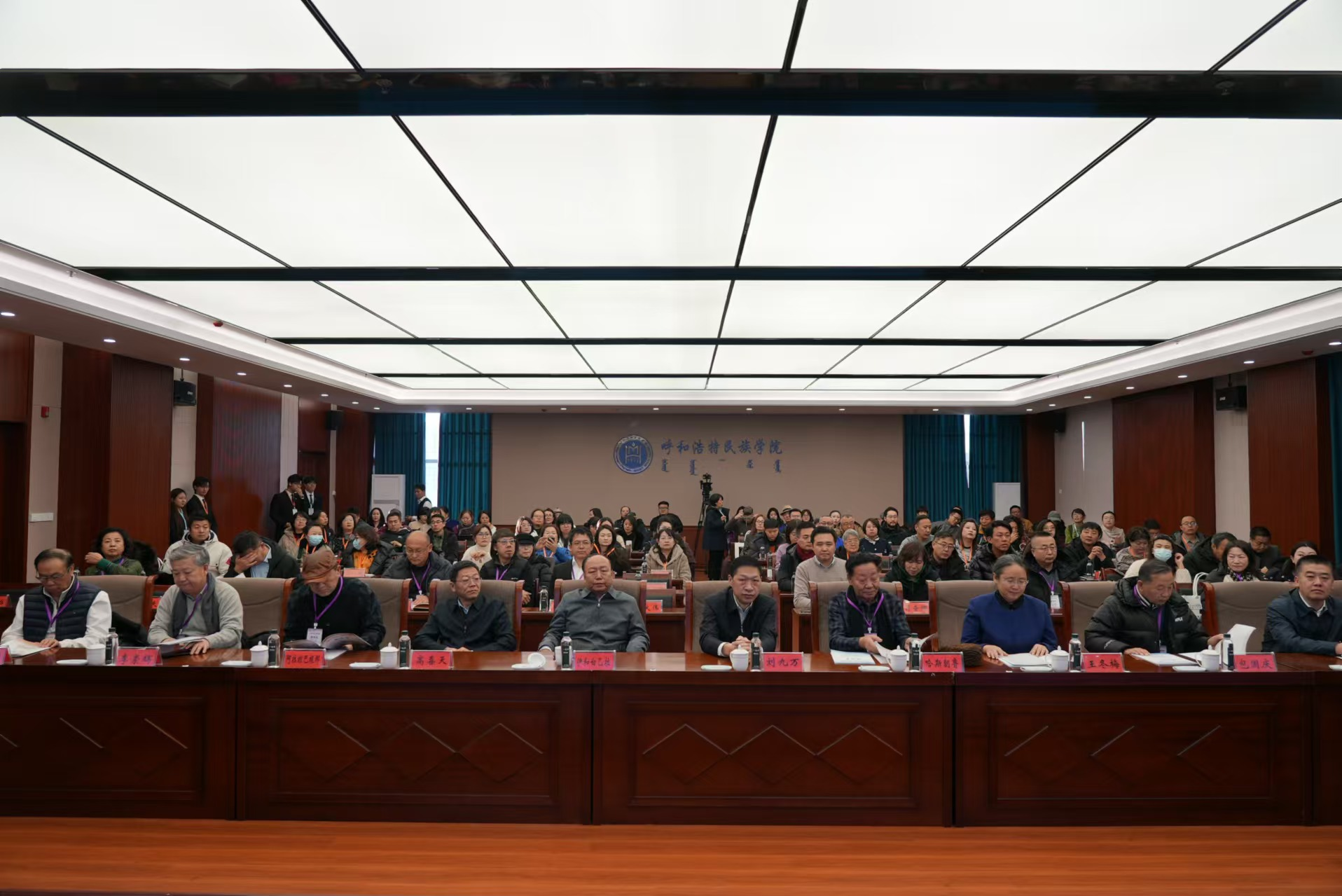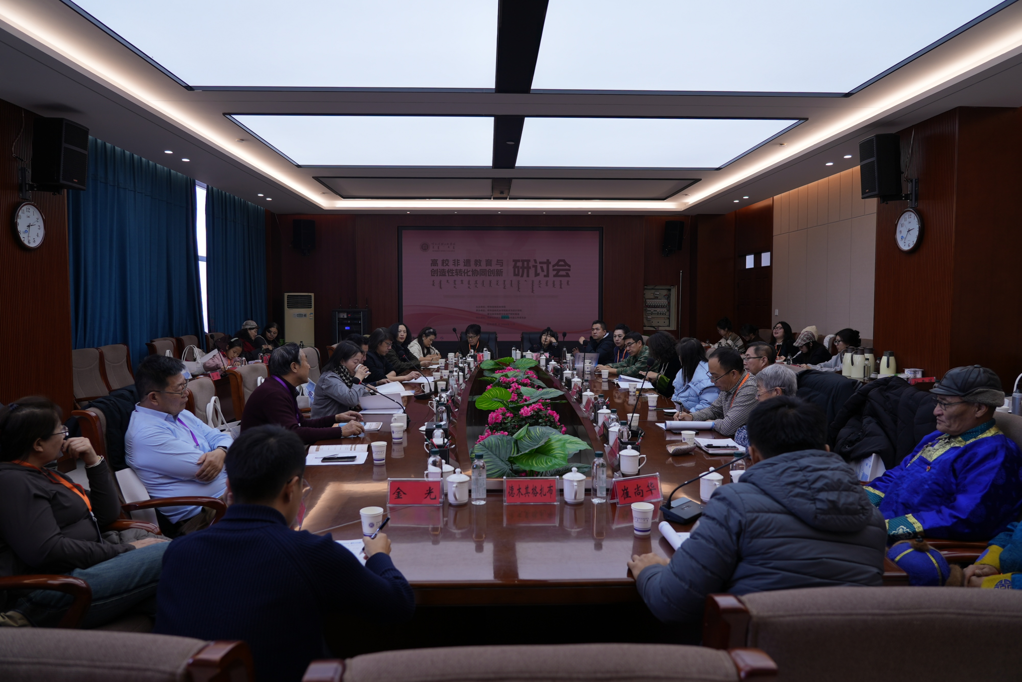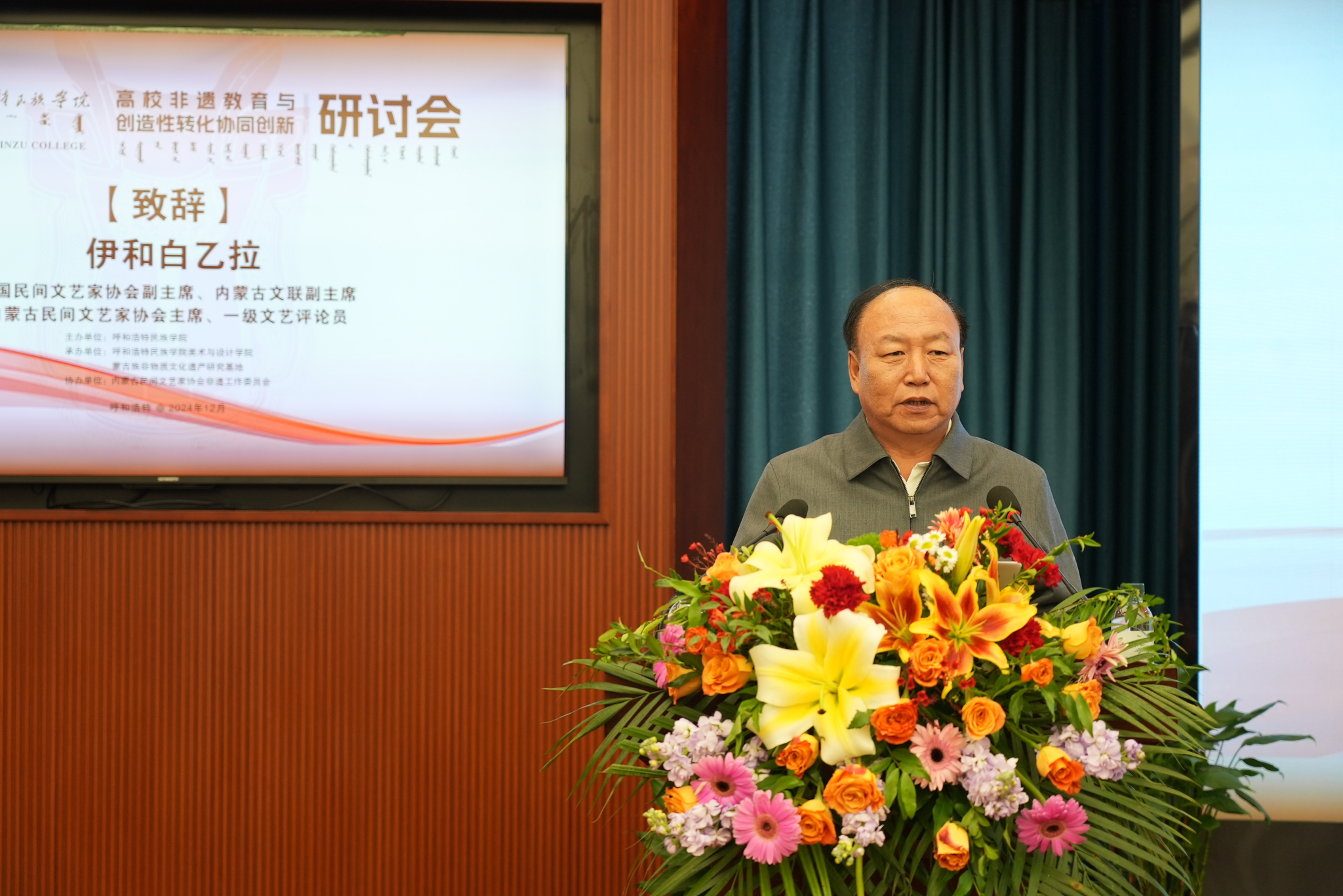 12月21日,由best365官网中文版登录主办,蒙古族非物质文化遗产研究基地和美术与设计学院联合承办的全区“高校非遗教育与创造性转化协同创新研讨会”在综合楼12楼会议室举行。校党委书记刘九万,党委委员、纪委书记、监察专员王冬梅,党委委员、副校长高喜天等校领导出席研讨会。中国民间文艺家协会副主席、内蒙古文联副主席伊和白乙拉;中国美术家协会重彩画研究会理事、内蒙古青年文学艺术家协会理事哈斯朝鲁教授;内蒙古自治区民族事务委员会地方语言文字研究应用中心主任阿拉坦巴根那;中国工艺美术协会副会长,内蒙古自治区工艺美术协会会长包国庆;内蒙古民协副主席、内蒙古师范大学教授李崇辉;亚太工艺美术大师、国家级工艺美术大师、国家级蒙镶工艺及金银细工领头人潘德月等领导与专家学者应邀出席研讨会。来自全区多所兄弟院校及各行各业的专家学者和省市级非遗传承人、工艺美术大师等150余人参加本次学术研讨会。美术与设计学院党总支书记吴利春主持研讨会开幕式,美术与设计学院副院长塔娜主持主旨发言环节。