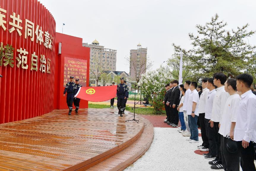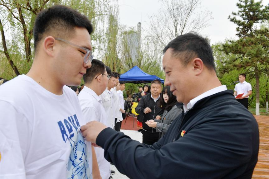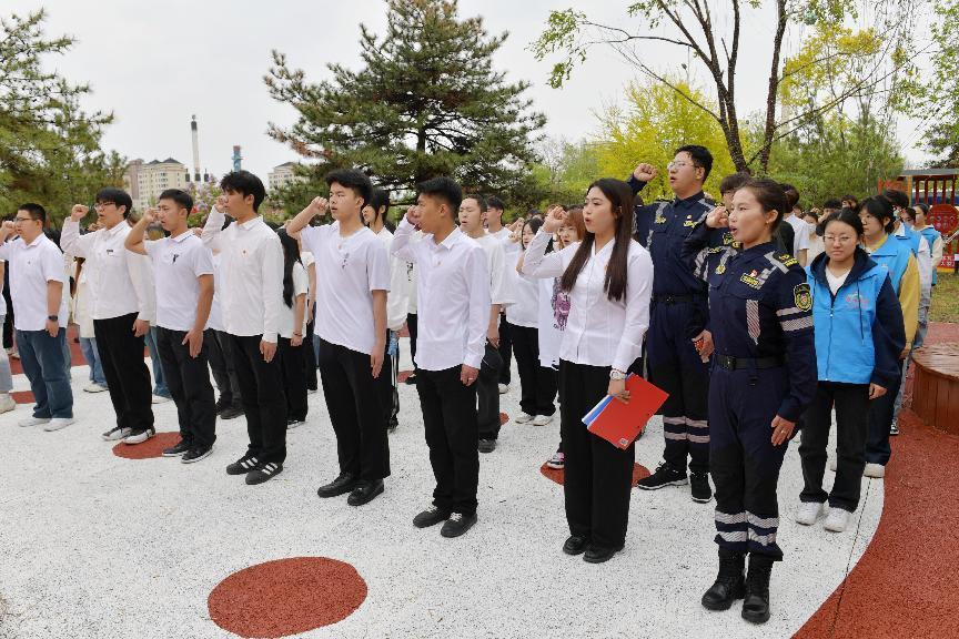 为深入学习贯彻习近平新时代中国特色社会主义思想,贯彻落实习近平总书记关于青年工作的重要论述,激发广大团员和青年纪念和传承五四精神,勇担青春使命、争做时代新人,4月28日上午,best365官网中文版登录美术学院团总支与回民区团委、内蒙古北疆志愿服务联合会、内蒙古师范大学青年政治学院、内蒙古建筑职业学院等四家单位在回民区“红石榴”志愿服务主题公园联合举办了“青春奋进新时代  挺膺担当向未来”2024年集中规范性入团仪式。我院团总支书记魏伟、辅导员吴丰林带领2024年新入团团员和“红石榴”志愿服务队成员参加活动。
