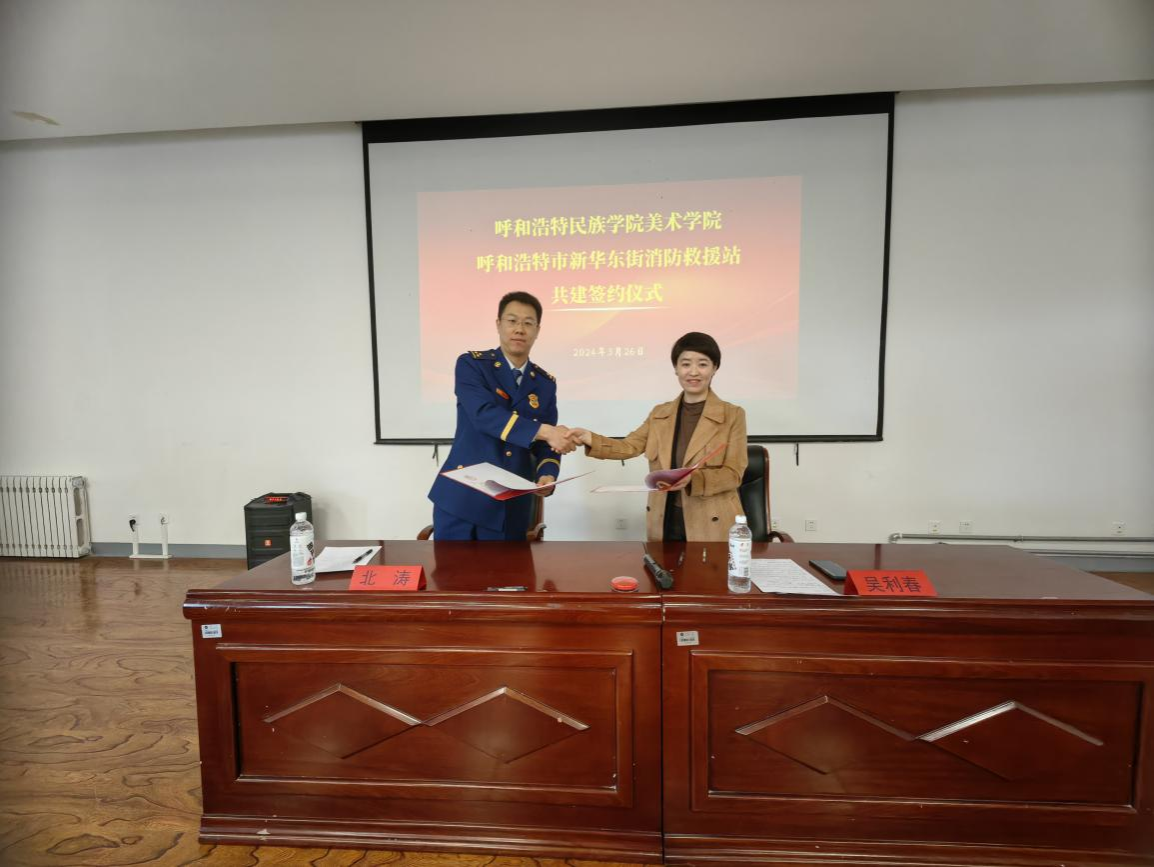 本次消防安全宣教活动共有三项内容。首先,美术学院与呼和浩特市新华东街消防救援站在美术楼四楼多媒体教室签订了党建共建合作协议。皆在发挥优势,形成资源互补,联合开展特色党日活动、民族团结进步、志愿服务和消防安全教育等实践活动,不断凝聚党组织战斗堡垒作用,有效增强双方的实践能力和协作精神,共同推进铸牢中华民族共同体意识教育,全力守护平安、和谐、美丽的校园环境。