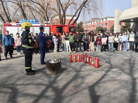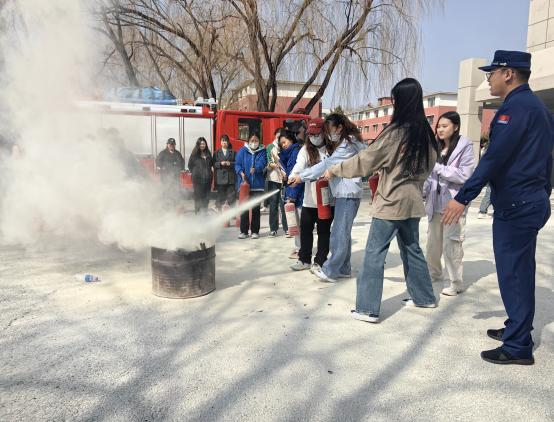 最后,组织全体师生在美术楼楼下,进行灭火实操演练,现场教学干粉灭火器的使用方法、步骤以及注意事项,切实提高了师生应对突发火灾事件后的应急处置能力。