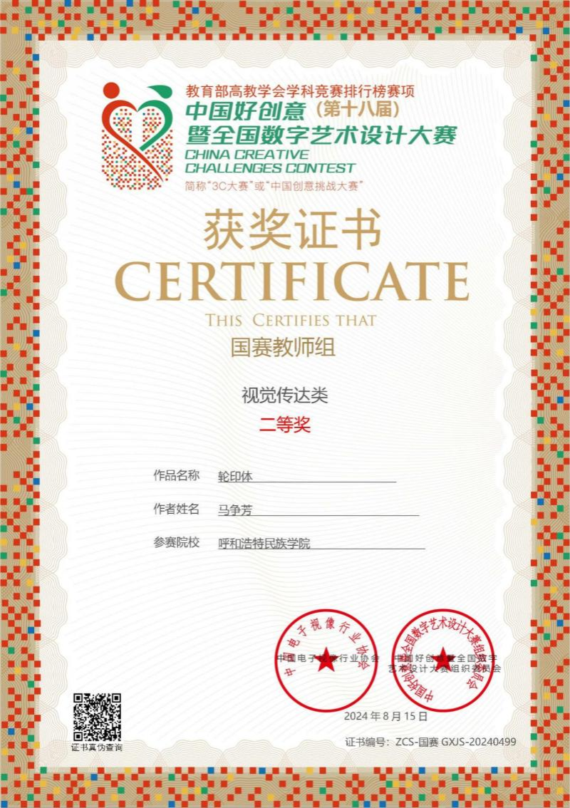 由中国电子视像行业协会主办的2024年(第十八届)中国好创意暨全国数字艺术设计大赛中,best365美术与设计学院教师马挣芳参与指导的6个作品分别获得了两项国赛教师组二等奖和内蒙古赛区二、三等、优秀奖的好成绩。