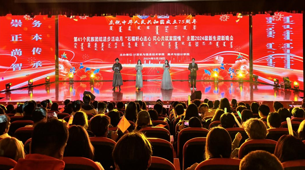 金秋送爽,丹桂飘香。为热烈庆祝中华人民共和国成立75周年,深入开展学校第41个民族团结进步月活动,9月29日晚,美术与设计学院联合计算机与信息技术学院在北院图书馆二楼报告厅联合举办了“石榴籽心连心 同心共筑家国情”为主题的2024级新生迎新晚会。