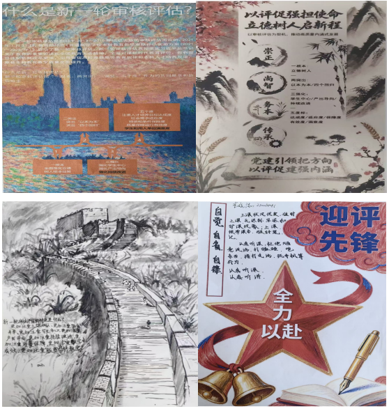 活动紧密围绕审核评估“以评促建、以评促改、以评促管、以评促强”的目标,结合专业特色,组织策划主题标语海报设计、主题绘画创作等系列项,共征集到各类创意作品60余件。作品充分发挥视觉传达设计的创意构图优势、绘画艺术的色彩张力特性及环境设计的空间表达能力,将“新一轮审核评估是什么”“审核评估的核心特点”“学生如何参与迎评工作”等关键内容转化为生动鲜活的视觉语言,强化宣传内容的吸引力与艺术感染力的同时,进一步深化学生对审核评估工作的思想认知和行动自觉,有效激发了青年学子“爱校荣校、强校有我”的责任担当。