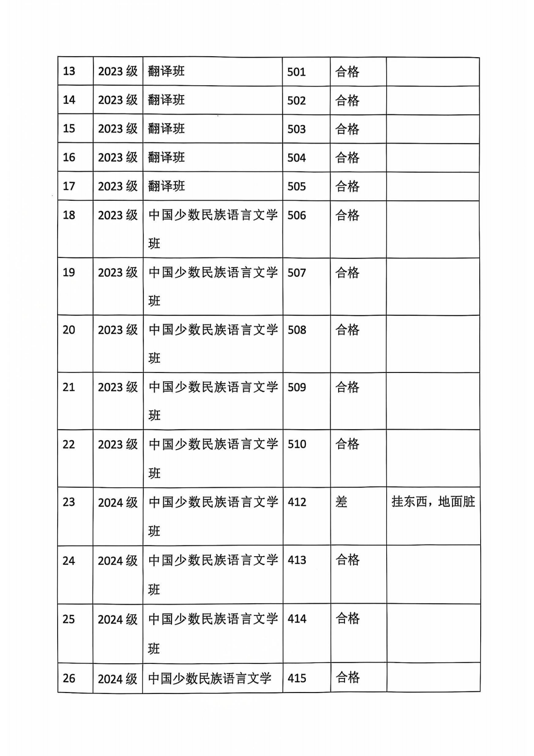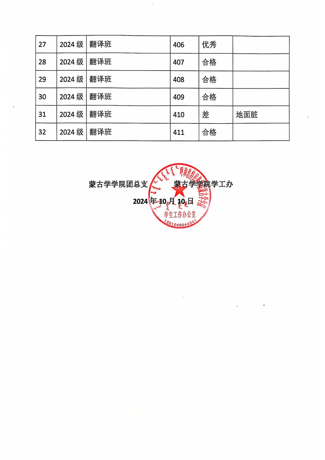 蒙古学学院宿舍卫生检查情况通报10.11