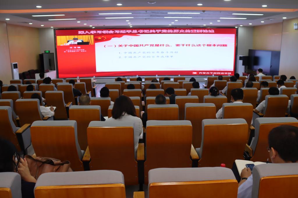 按照主题教育工作安排,7月11日上午,在北区图书馆一楼报告厅开展主题教育第二期专题读书班暨党委理论学习中心组(扩大)学习活动,组织全校副处级以上干部参加由自治区党委组织部在内蒙古干部网络学院“北疆云讲堂”举办的学习贯彻习近平新时代中国特色社会主义思想系列直播培训,深入学习领会习近平总书记关于党的历史的重要论述。