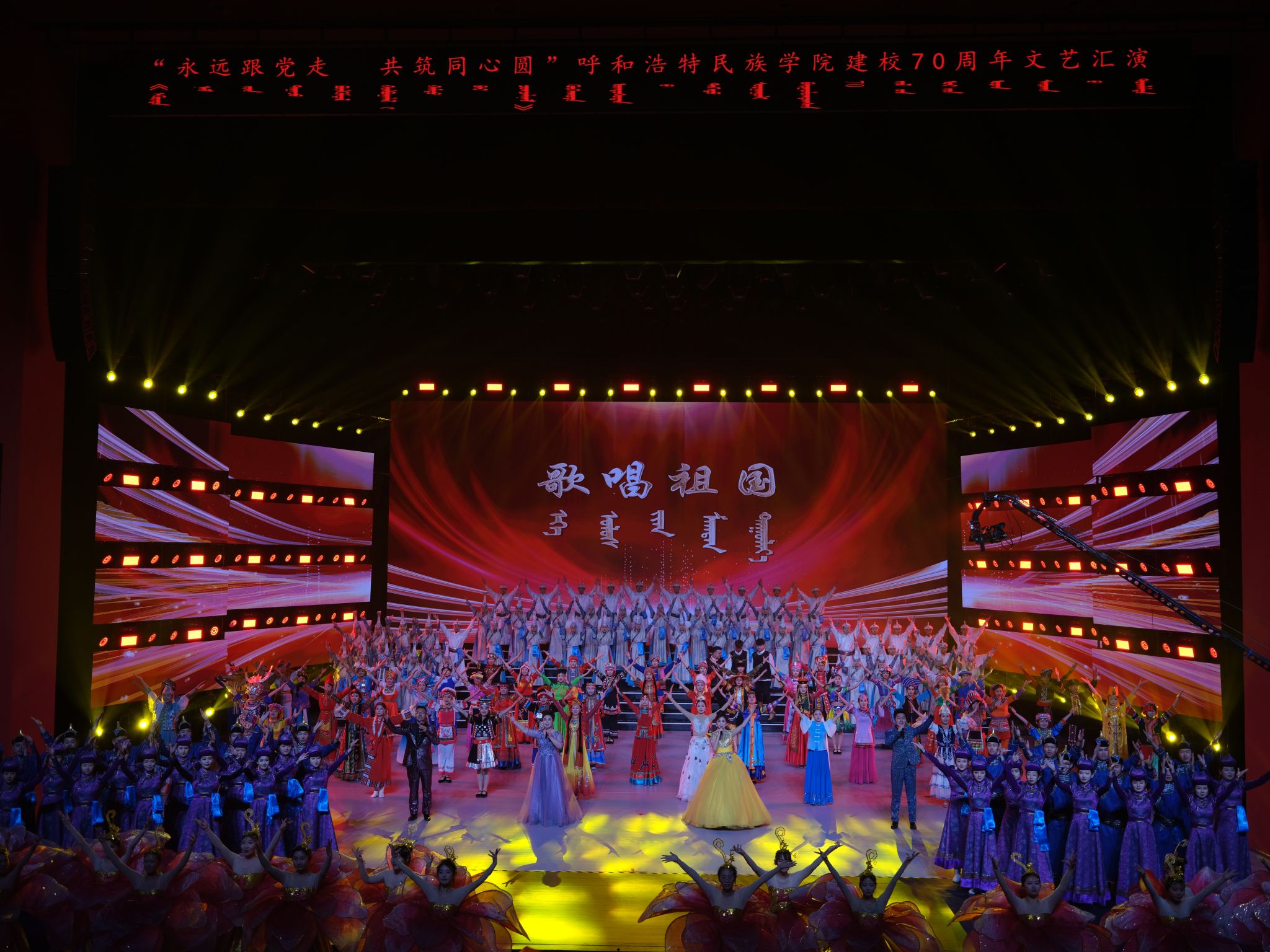 校党委书记刘九万,党委副书记、校长韩伟新等全体校领导陪同国家民委直属高校、地方民族院校、区内兄弟院校代表和广大校友、在校师生代表一同在现场观看了汇演。海内外全体呼民院人欢聚一堂、共襄盛会,共同回顾学校70年来走过的风雨历程,共同抒发对学校的深情厚谊,共同展望学校的美好未来。