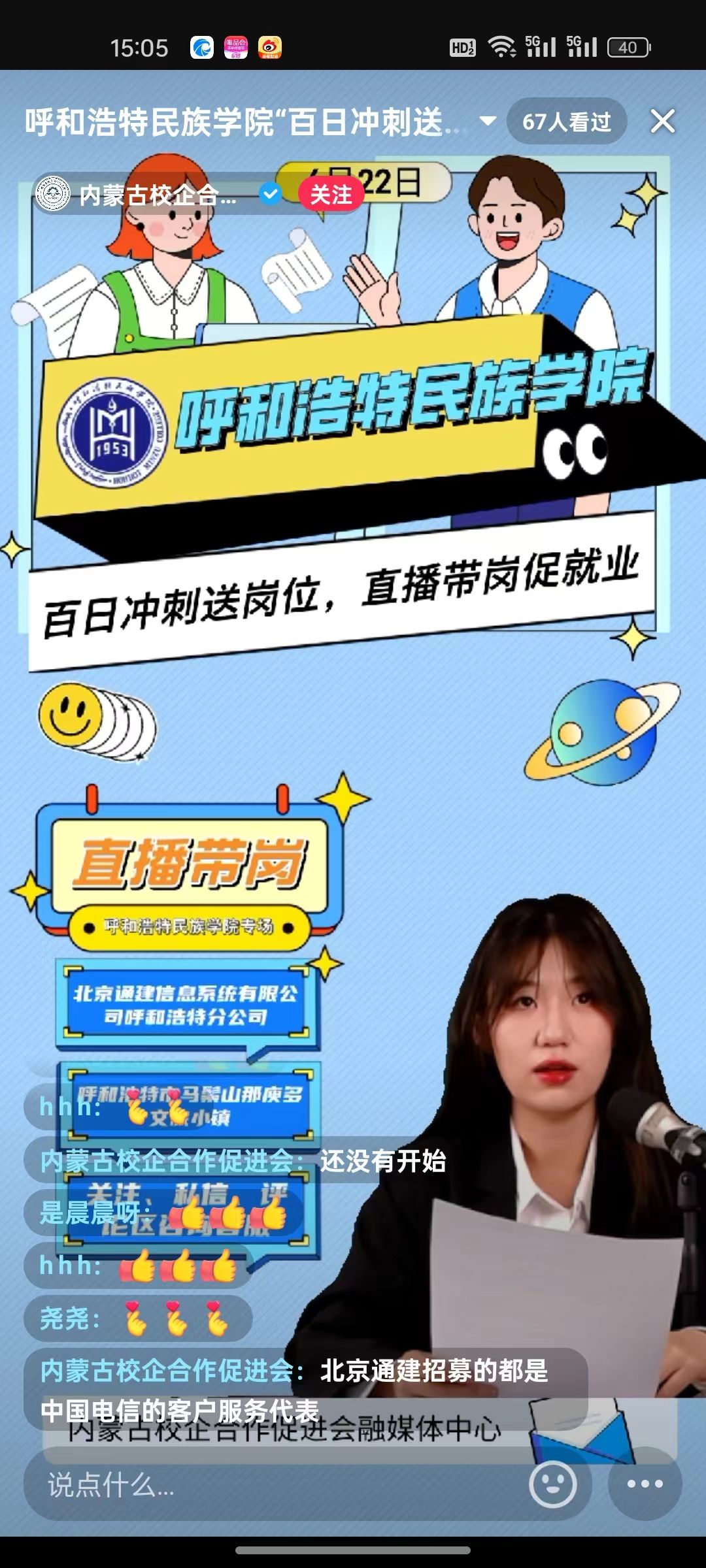 本次直播带岗活动是学校“百日冲刺”促就业攻坚行动的一部分。下一步,学校将持续为毕业生精准搭建就业供需平台,解决暑期线下招聘受时间、场地限制等问题,降低毕业生搜寻招聘信息的时间成本,实现就业服务和就业岗位的触屏可及,确保毕业生高质量充分就业。