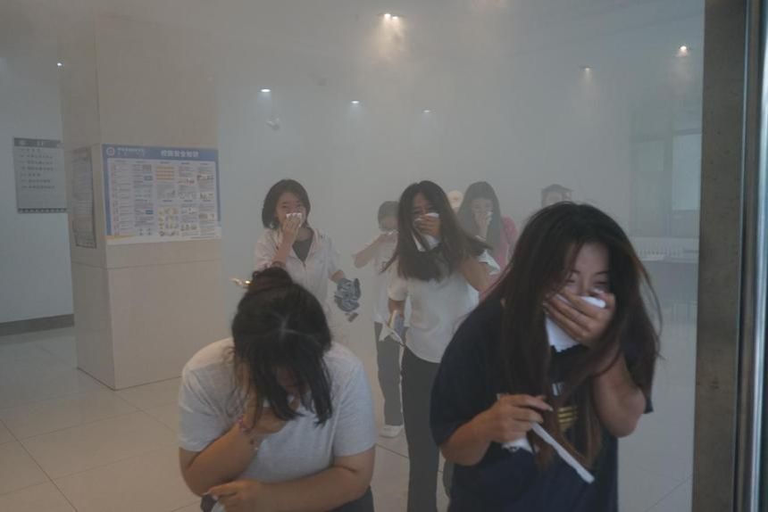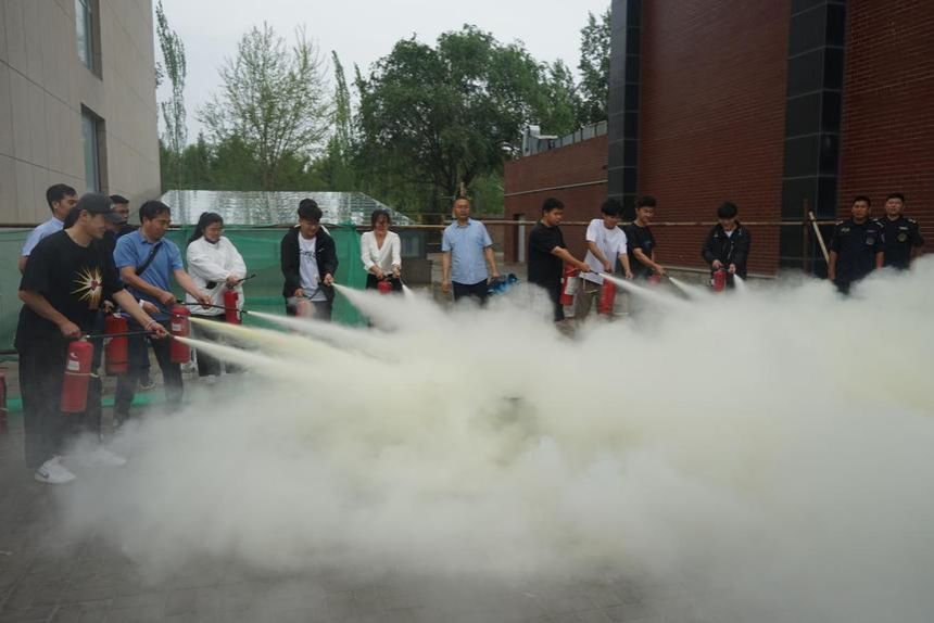 首先,在综合楼实验室进行授课,为师生讲解消防器材的种类、使用、灭火方法,火灾逃生疏散、应急自救、紧急救援等相关知识。随后,开展逃生应急演练,随着消防警报声的响起,师生们用湿毛巾捂住口鼻,弯腰低姿态,沿着逃生路线迅速有序的撤离到安全区域。最后,大家按照灭火器“一提、二拔、三握、四压”流程进行实战灭火演练。