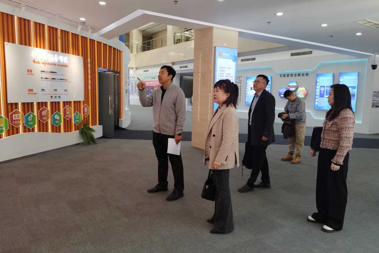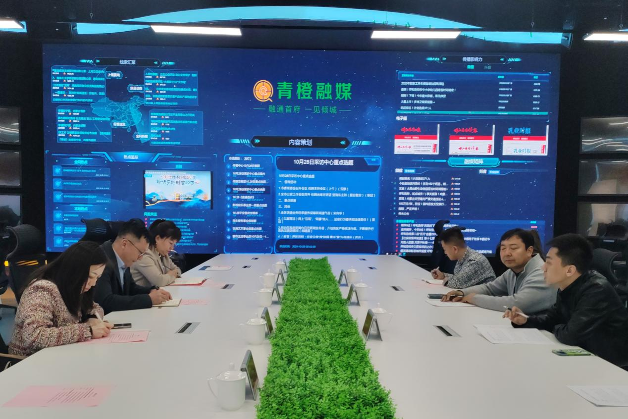 学院一行首先参观了解了“青橙融媒”品牌矩阵发展的简要历程与运行现状,随后与中心副总编辑前达门,副主任舒雨,国际传播事业部负责人阿古达木和校媒合作负责人邱宇展开座谈交流。前达门对学院到访表示欢迎,着重介绍了校媒合作模式与成功经验举措。学院领导班子成员分别从各自工作领域出发,谈及毕业生实习安排,寻求专业转型发展思路,探索校媒如何广泛与深入合作的路径。双方一致认为,在当前媒介深度融合的环境下,面对新媒体和互联网的独特属性,要大胆抛开“老路子”,关注和挖掘大学生群体的兴趣与潜力,围绕青年人的活力促生创作与生产,继而更进一步实现“校媒企”三方的共创与合作,达到育人、用人、利人协同发展。