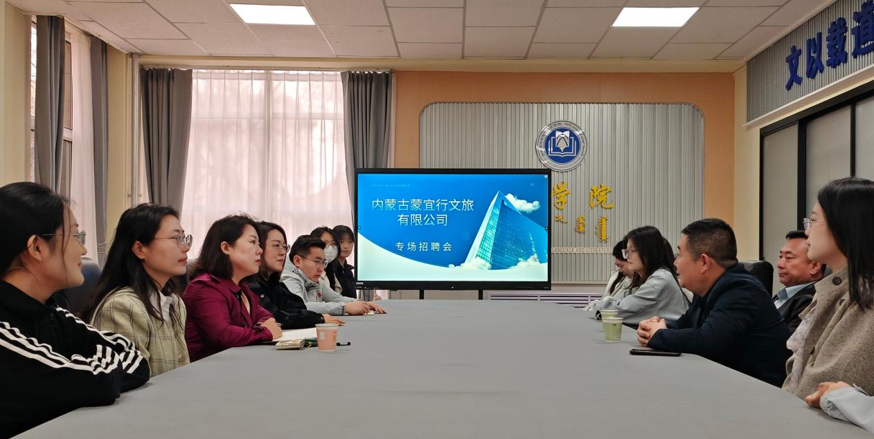 为有效解决文学院学生就业问题,为学生提供多样化就业选择,4月18日,文学院邀请内蒙古蒙宜行文旅有限公司举办专场招聘会。内蒙古蒙宜行有限公司经理李建章、王立勋,文学院院长高娃、党总支副书记包冬梅、辅导员以及25届、26届毕业生参加了本次招聘会。