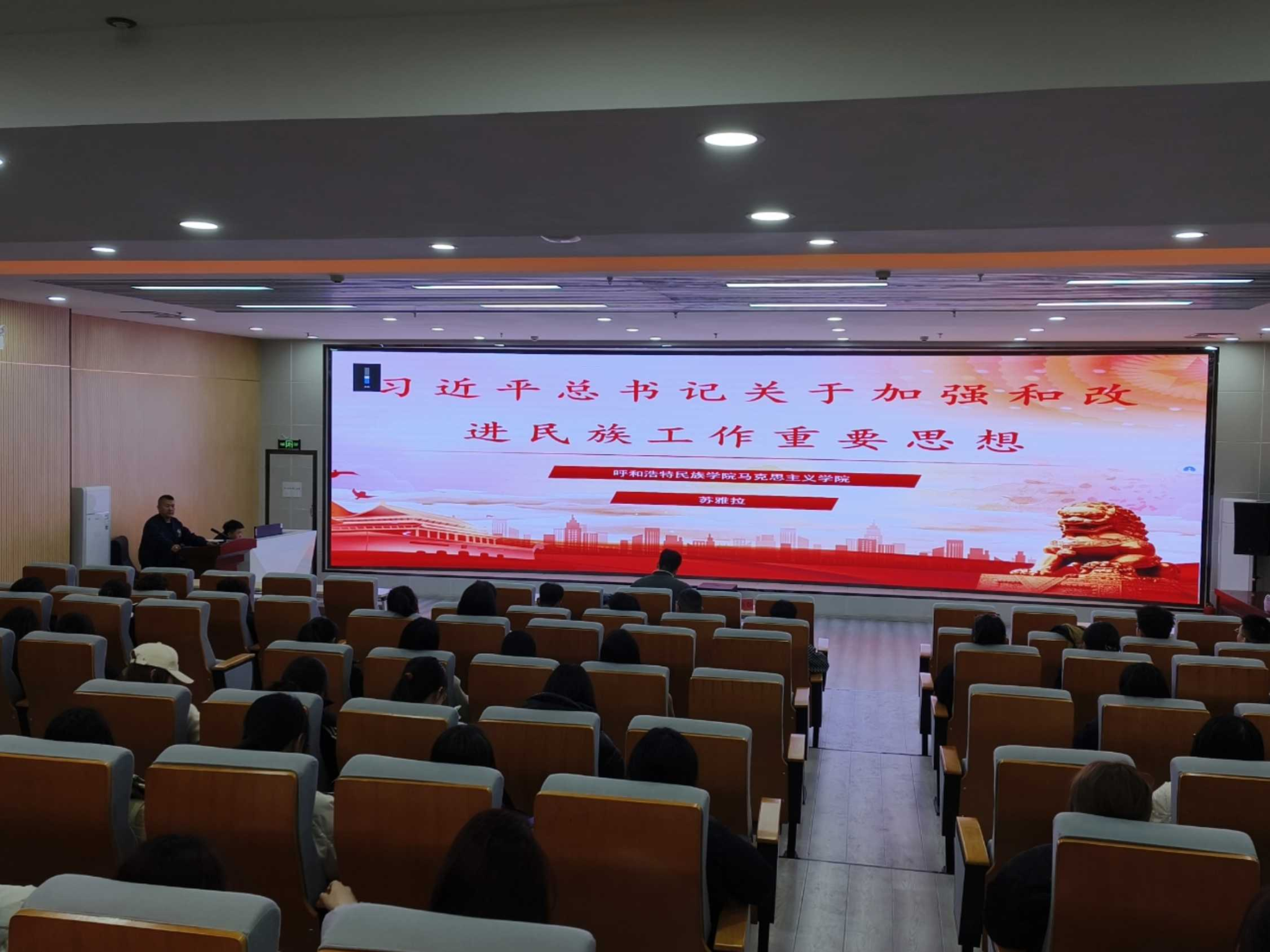 苏雅拉以习近平总书记关于加强和改进民族工作重要思想为题,详细讲解了中华民族共同体形成的因素及强化过程,带领学生全面、准确认识新形势下党的民族工作的时代背景,了解新时代民族工作面临的问题及任务。马克思主义学院专职辅导员姚培春及各年级120余名学生聆听了讲座。