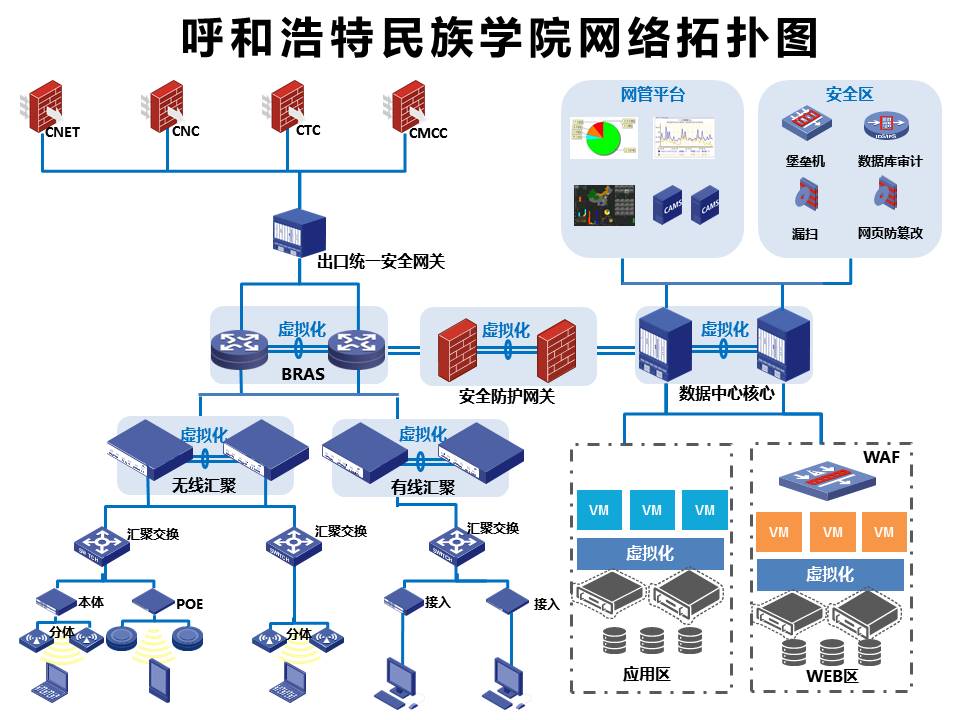 校园网按照核心交换、楼宇汇聚、用户接入三层网络拓扑结构规划建设。核心采用两台万兆交换机,核心与楼宇汇聚万兆互联,千兆到终端用户桌面,目前万兆楼宇主干节点数量已达到43个。校园网络总出口带宽达到5.5G,校内铺设光缆50余公里,信息点6500多,教学、办公区有线、无线网络已全覆盖,支持IPv4/IPv6的门户网站已上线运行。校园卡系统实现了三方充值和聚合支付功能,校园卡与人脸识别系统联动实现“卡、码、脸”灵活的校园出入管理。校园网络中按照信息安全等级保护要求部署了安全设备和防护措施。