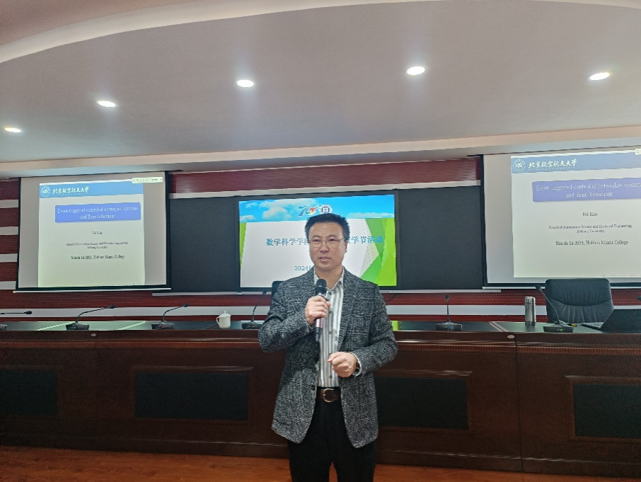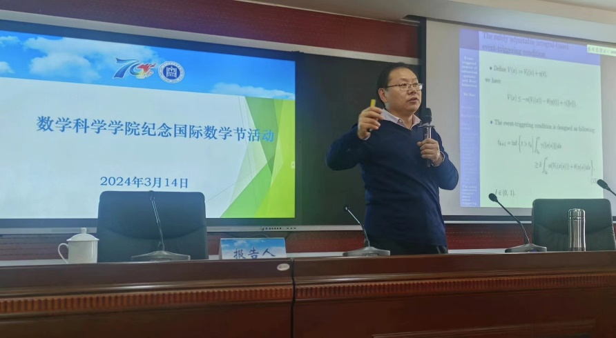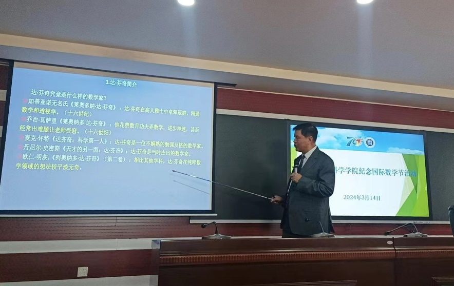 活动邀请北京航空航天大学教授、博士生导师郝飞,内蒙古师范大学二级教授、博士生导师代钦作分别作了题为《网络化系统中事件触发控制的若干问题及讨论》《达·芬奇的数学世界》的专题讲座,两位专家学识渊博、专业基础深厚,在报告中紧密结合学科专业实际,旁征博引,深入阐释了数学理论与文化的内涵。此次报告对提高教师教育教学水平、激发学生学习数学热情和加强学院数学文化建设起到了积极作用。