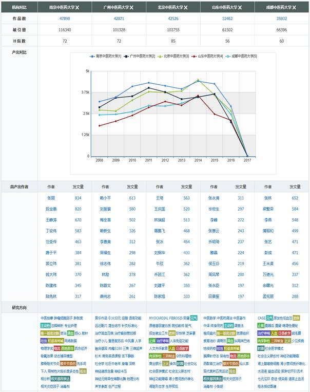 平台提供“作者”、“机构”、“基金”、“期刊”、“主题”等同类对象之间的产出对比报告。您可以按需勾选比较对象,点击“对象比较”按钮来查看相应信息。最大支持5个对象的比较。
