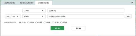 如需查找人物为“王伟光”,机构限定为“中国社会科学院”的人物对象,则可以在高级检索-对象检索页面做以下设置。
