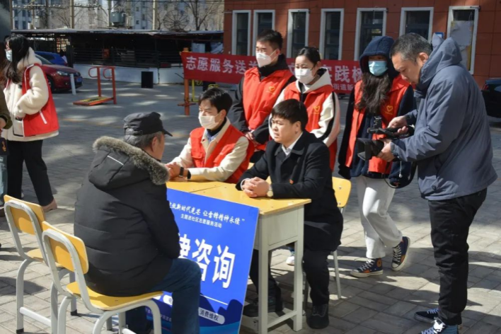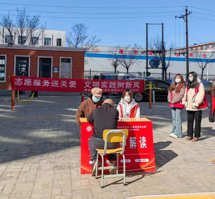 来自马克思主义学院的师生志愿者在社区向居民讲解两会精神以及惠民政策,加深民众对教育、养老、医疗、住房保障等方面国家政策的理解,了解新政策带来的变化。