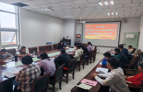 为持续深入贯彻落实中央八项规定精神,进一步加强党风廉政建设,强化党员干部纪律意识和作风建设,体育学院党总支于4月10日、4月15日、4月24日,分别在体育馆三楼会议室开展了第二期、第三期、第四期深入贯彻中央八项规定精神学习教育专题读书班。第四期读书班同时开展专题研讨会,全体中心组成员及全体党员参会,会议由学院党总支书记萨日胡主持。