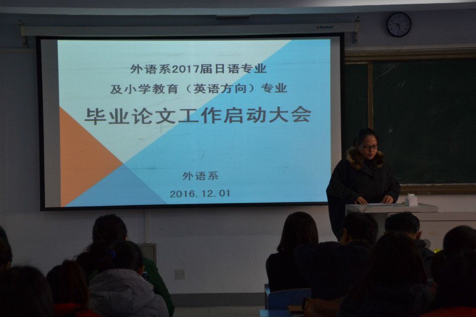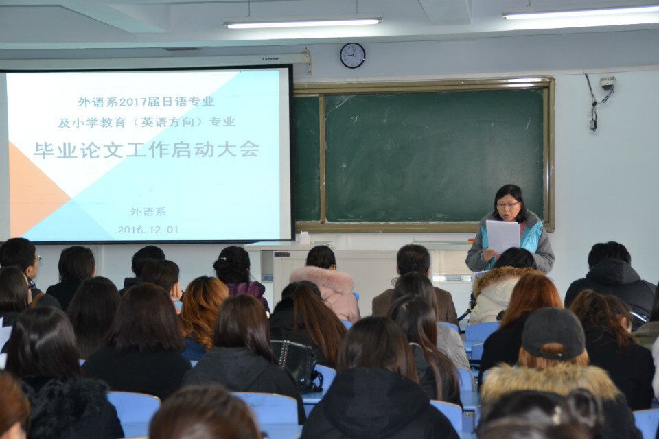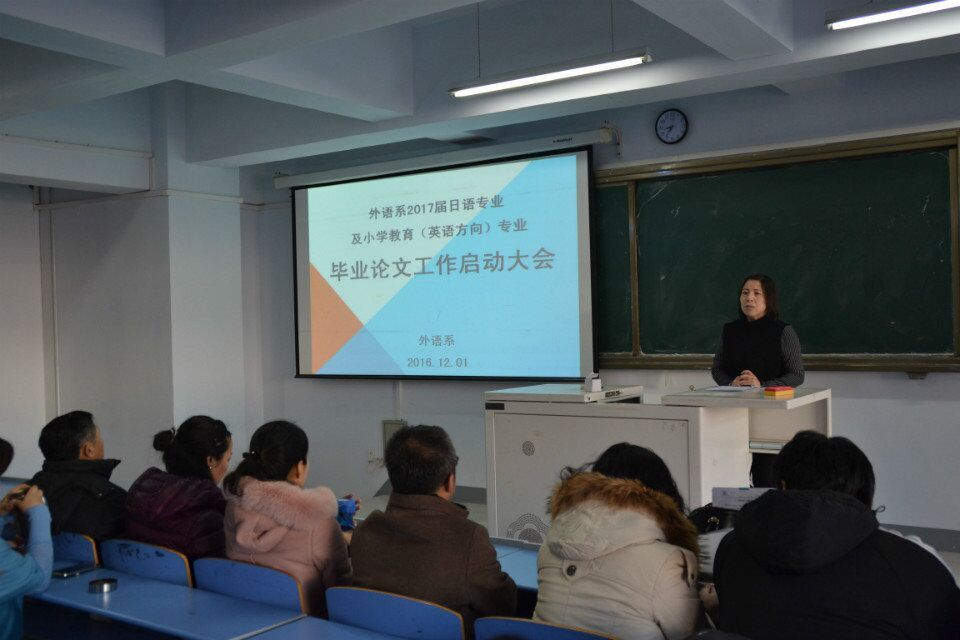 2016年12月1日上午10:00,外语系在都林楼206教室召开了2017届日语专业及小学教育(英语方向)专业毕业论文工作启动大会。动员大会由英语教研室红霞主任主持,外语系肖查娜主任、毕业论文指导教师及2017届日语专业、小学教育(英语方向)专业全体学生参加了本次会议。