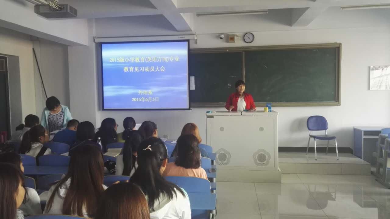 本次见习动员大会的召开,使2015级小学教育(英语方向)专业的学生们了解了见习工作任务,认识到见习的重要性,明确了纪律要求,为他们顺利完成见习任务奠定了良好的基础。