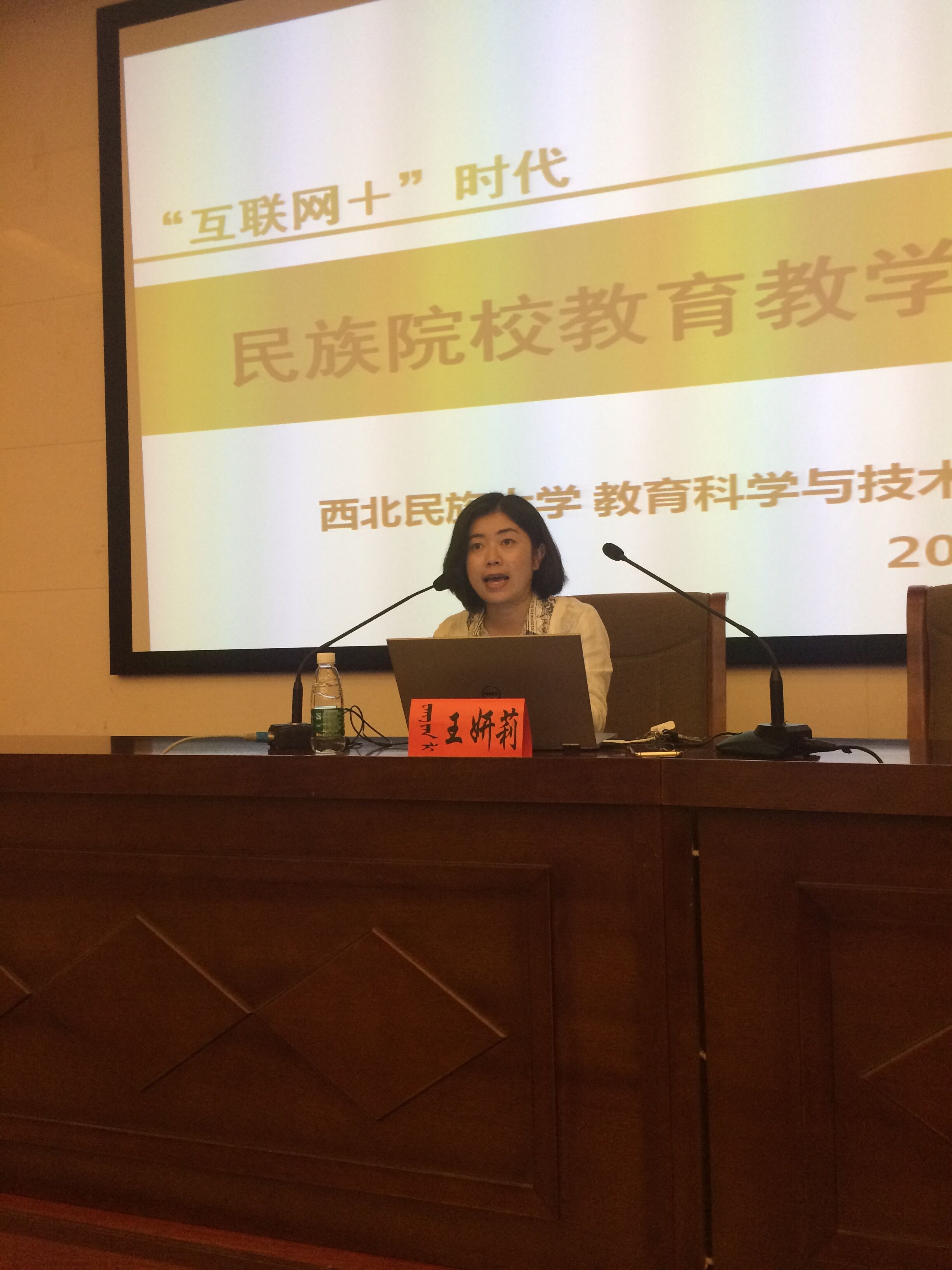 接着,王妍莉老师的讲座《互联网+时代民族院校教育改革实践》令老师们和学生们印象深刻。王妍莉老师是西北民族大学教育科学与技术学院副教授,教育学博士,硕士生导师。近年在国内学术刊物上发表论文20余篇, CSSCI核心期刊10余篇,A类出版社主编出版著作1部,参编教材3部。主持教育部人文社科项目1项,先后参与国家社会科学基金、教育部人文社科项目、甘肃省社会科学基金项目、西北民族大学创新团队项目近十余项科研课题,获甘肃省教学成果奖。王老师首先分析了当前互联网+时代下的机遇和困惑,提倡应用现代教育技术来进行教育具体实践,通过她的实际课程向我们展示教育技术是如何促进学生的学习,为教师的教学改革提供了创新点和突破口。