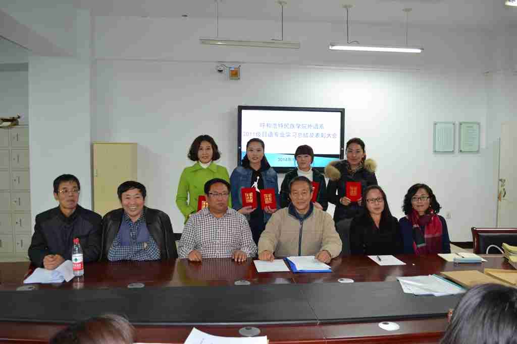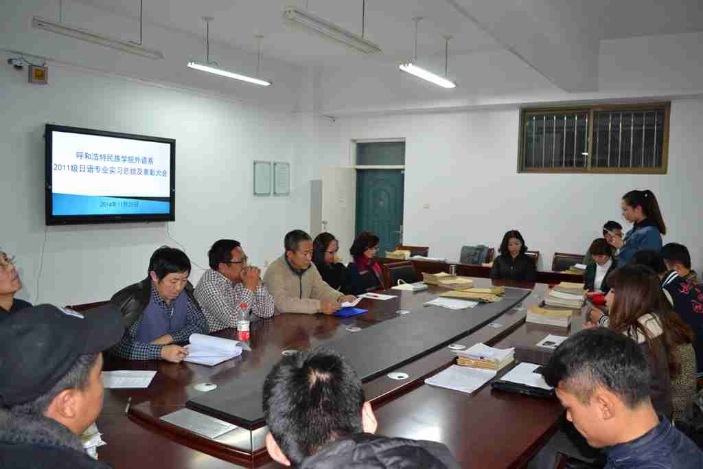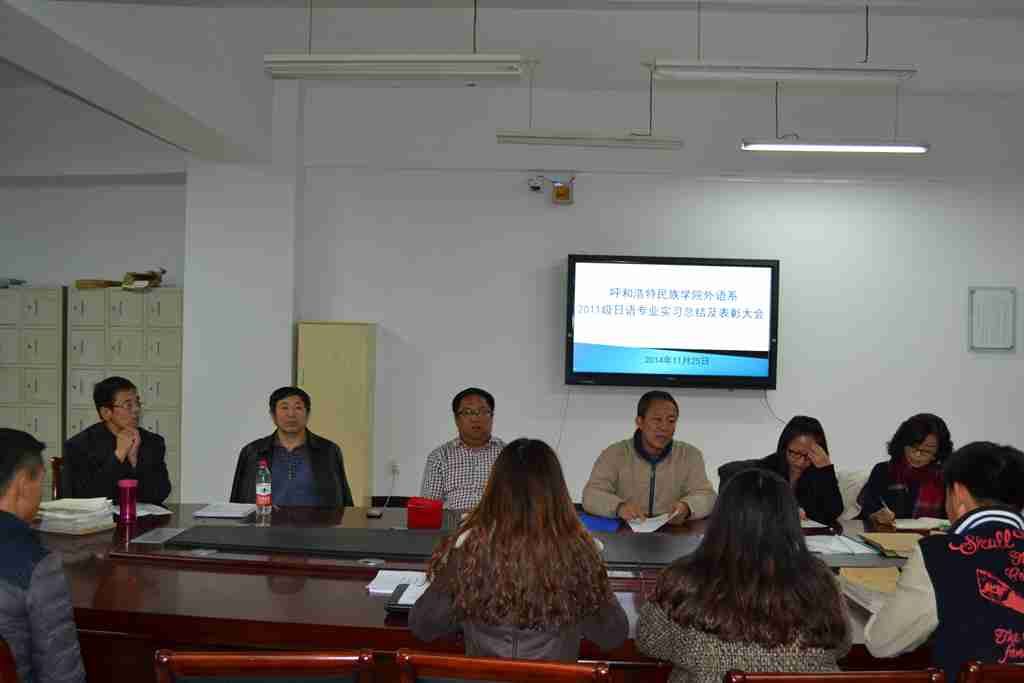2014年11月25日晚,外语系在本系会议室召开了2011级日语专业毕业实习总结及表彰大会。系党总支布和朝鲁书记、日语教研室包金山主任、日语教研全体教师及2011级日语专业全体同学出席了本次会议。