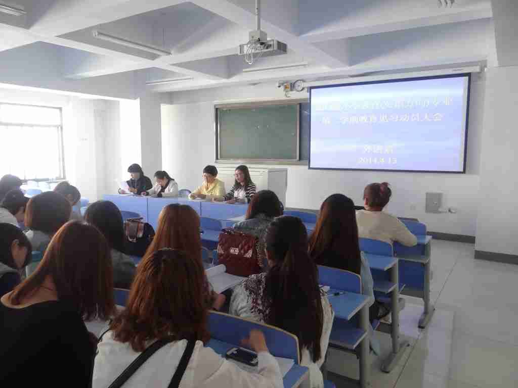 2014年4月13日上午10:30,外语系在618教室召开了2013级小学教育(英语方向)专业第二学期教育见习动员大会。大会由外语系英语教研室负责人红霞老师主持,见习指导教师王牧兰、乌日娜、乌云斯日古楞及2013级小学教育(英语方向)专业一、二班全体学生参会。