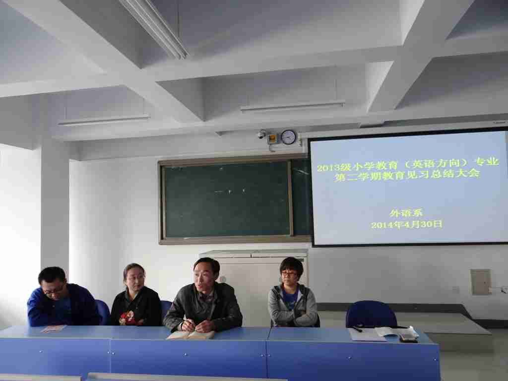 外语系于2014年4月30日下午4:40时在外语系618教室进行了外语系2013级小学教育(英语方向)专业第二学期教育见习总结大会。大会由外语系英语教研室负责人红霞主持,并作见习总结。其后, 2013级小学教育(英语方向)专业一班的乌雅罕同学和2013级小学教育(英语方向)专业二班的于莹同学代表见习生发言。最后,系副主任苏日嘎拉图老师对见习工作进行了全面总结,并对见习生寄言,希望他们在以后的专业学习上继续努力,为将来做一名合格的小学英语教师做好充分的准备。