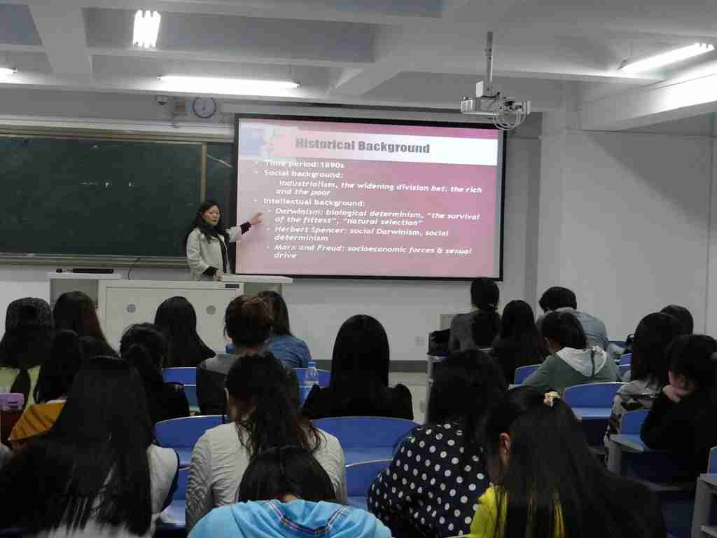 2014年5月6日至8日,中央民族大学外国语学院英语系主任、硕士生导师朱小琳教授赴我系讲学,先后为师生奉上题为《民俗文学中的美国精神》、《社会转型期的文学心灵之旅》和《蓝袜子沙龙:美国女作家的文艺之路》三场精彩讲座。