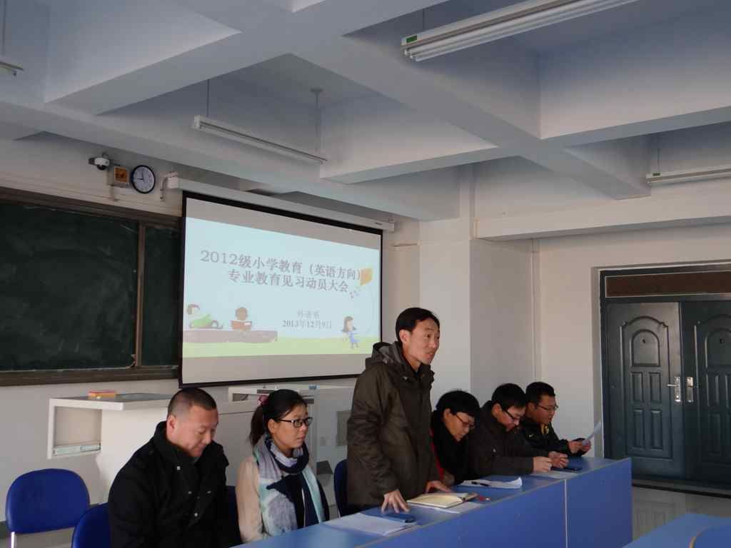2013年12月9日上午9时,外语系在618教室举行了2012级小学教育(英语方向)专业教育见习动员大会。大会由外语系英语教研室负责人红霞主持,系领导苏日嘎拉图副主任、团总支书记包仓、见习指导教师王牧兰、胡日查、葛木仁及2012级小学教育(英语方向)专业一、二班全体学生参加。大会伊始,苏日嘎拉图副主任作动员报告,明确了教育见习的意义、重要性,并对见习生提出认真对待教育见习的每一个环节,圆满完成教育见习任务的殷切希望。随后,见习指导教师胡日查宣读了《外语系2012级小学教育(英语方向)专业第三学期见习方案》,明确了教育见习目的和任务、教育见习内容、教育见习形式及对指导教师、见习生的具体要求。最后,见习指导教师王牧兰结合专业特点,对如何通过见习提高个人职业技能向全体见习生提出了几点建议。