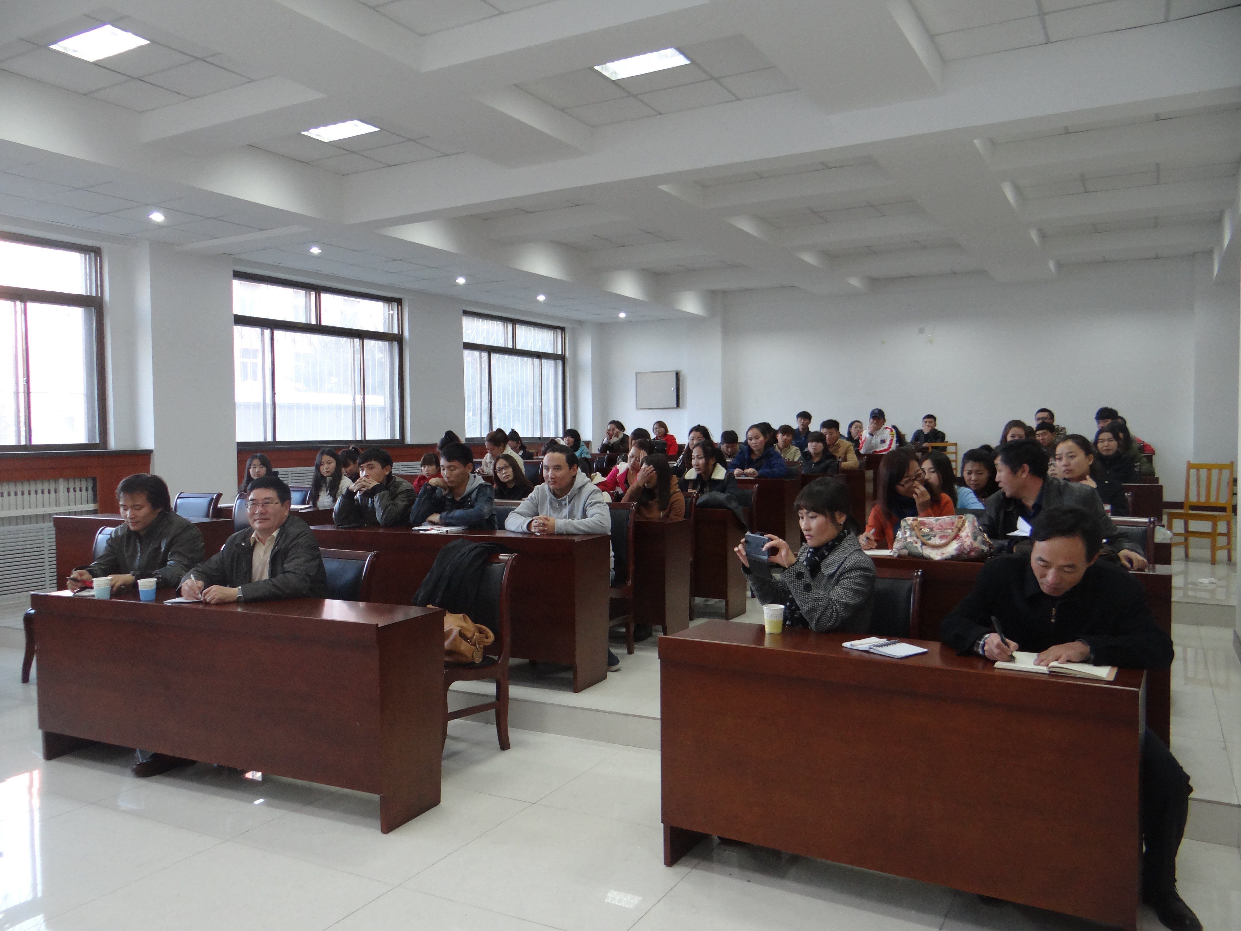 为了提高日语专业师生专业水平,活跃学术交流,2013年11月6日下午4:30—6:00,外语系邀请蒙古国国立大学蒙古语言文化学院外语系Erdenesan Togtuun教授在教学楼106教室为日语专业师生做了题为《蒙古语授课学生日语学习策略》的学术讲座。日语专业教师及日语专业蒙古语授课班学生100多人收听了讲座。
