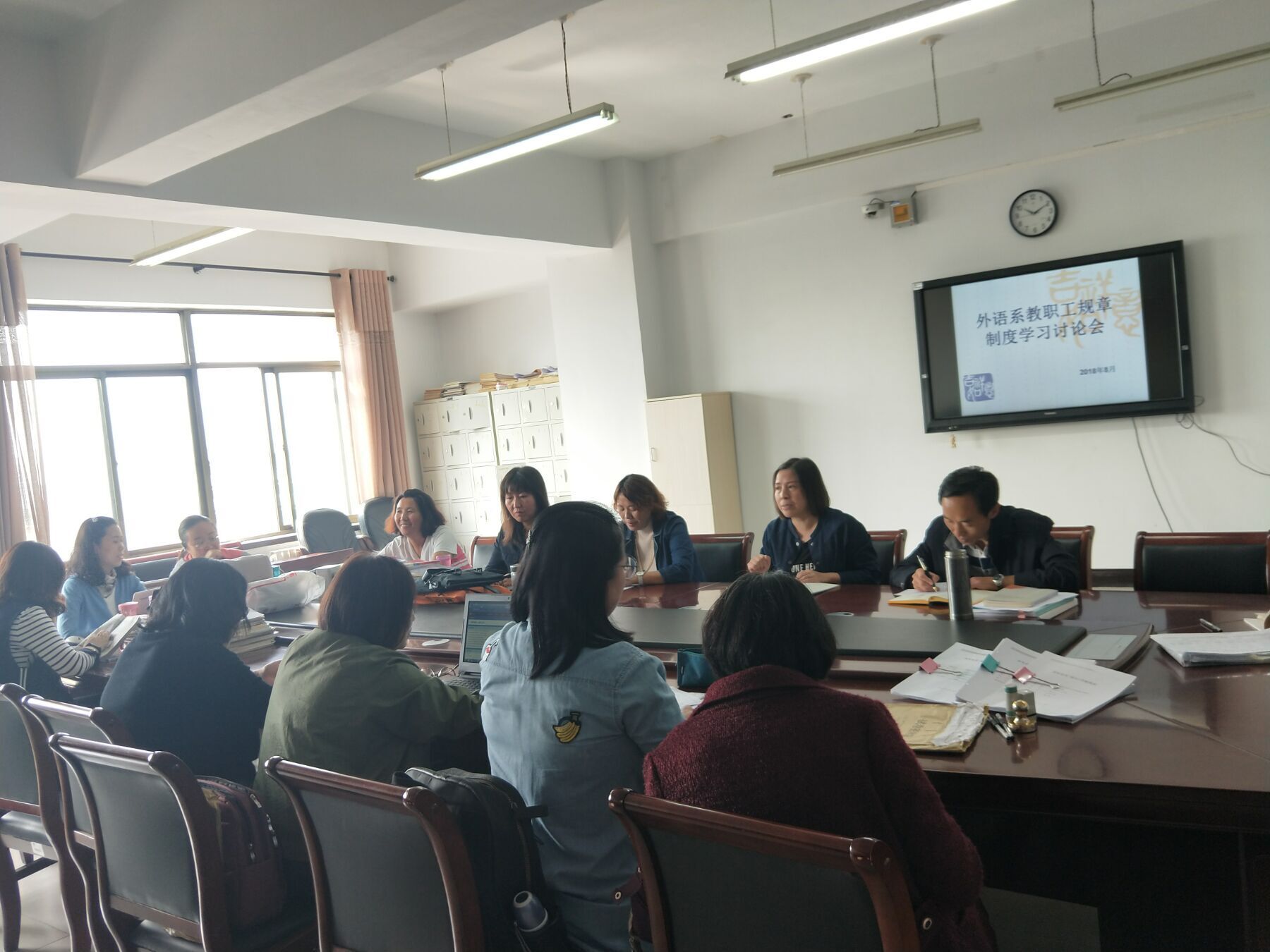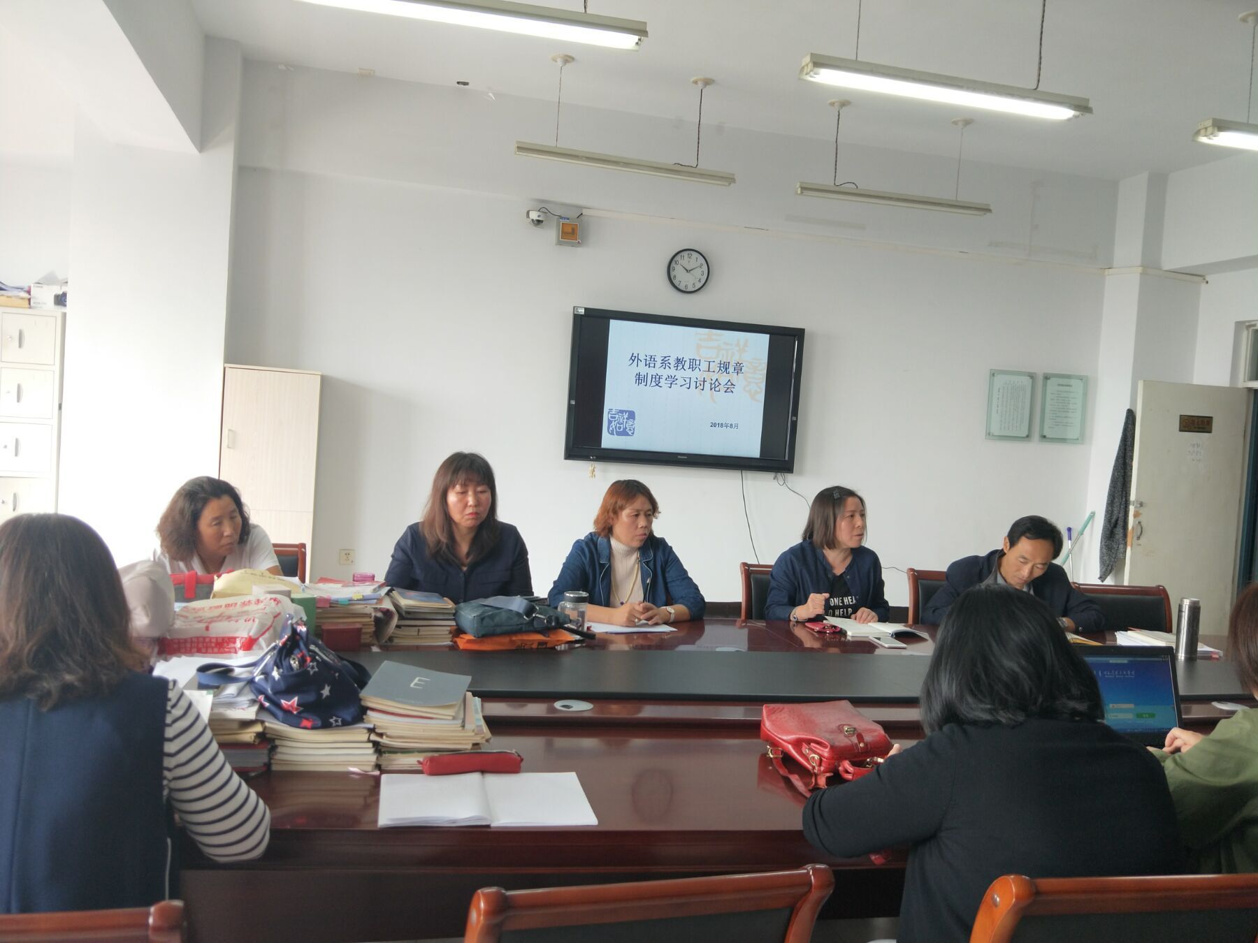 在此基础上,于2018年8月31日下午在系会议室召开了“外语系教职工规章制度学习讨论会”。会上老师们围绕所学的法规,结合本职工作,展开了热烈的讨论。教职工提出的主要的意见和建议包括共同加强教风和学风建设、完善考试考查制度、重视师生对外交流学习、及时排除教学设备故障、狠抓毕业论文质量等。