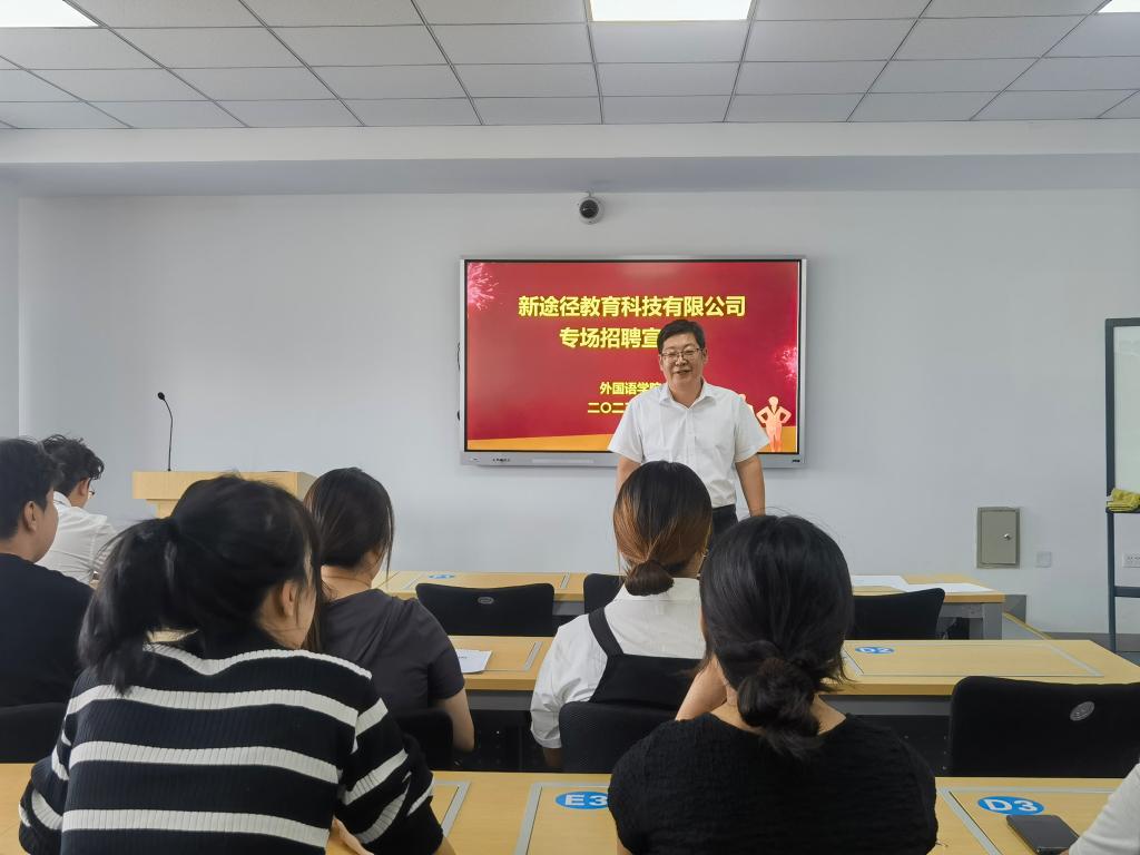 为更好地拓宽毕业生就业渠道,帮助2023届毕业生顺利就业,6月29日下午,外国语学院邀请途径教育科技有限公司行政人力总监于义一行来校开展访企拓岗座谈会并召开专场招聘宣讲会。外国语学院领导班子出席座谈会,会议由党总支书记朱俊杰主持。