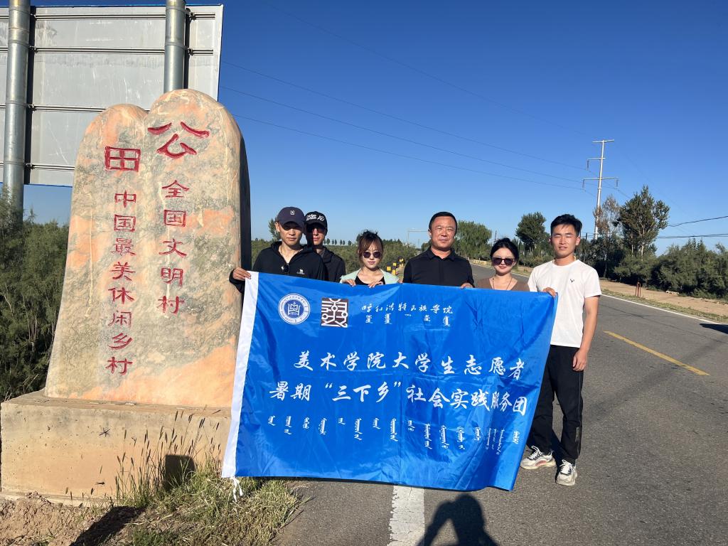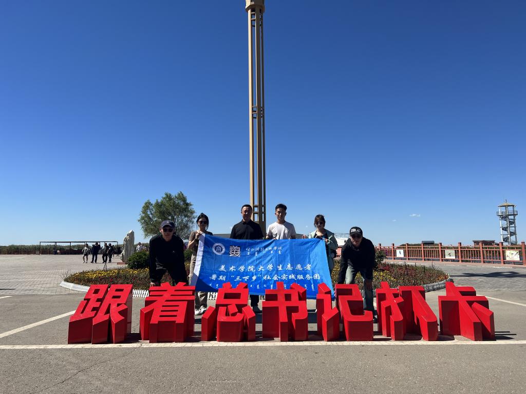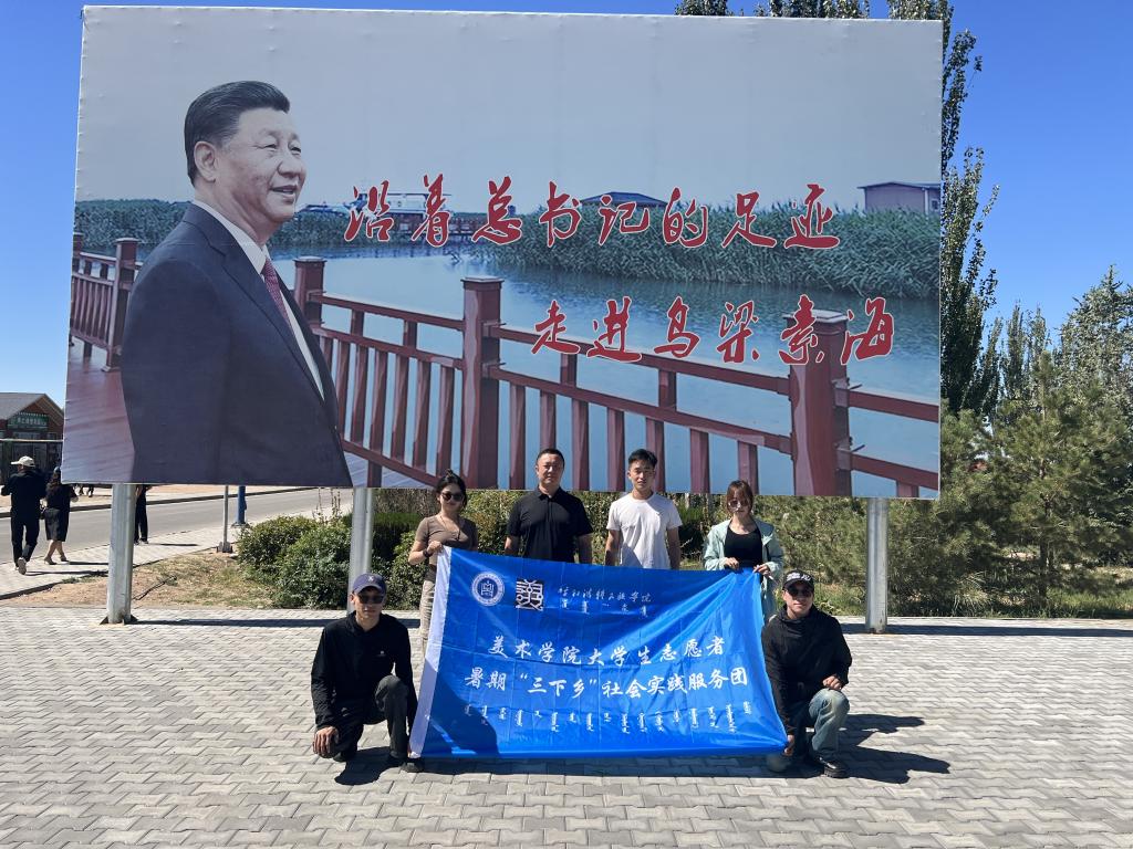 美术学院社会实践团赴内蒙古巴彦淖尔市重温总书记走过的路,实地参观了解乌梁素海坚持山水林田湖草沙一体化保护和促进生态环境建设的历程,进一步学习习近平总书记在巴彦淖尔市考察并主持召开加强荒漠化综合防治和推进“三北”等重点生态工程建设座谈会的重要讲话精神;在乌拉特前旗公田村河套文化博物馆,通过具体的形态、真实的故事在参观中受到了一次深刻的党史教育,重温了悠久的河套农耕文明和农业发展的历史进程。
