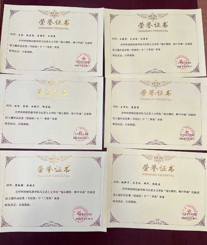 为深入贯彻落实习近平总书记关于加强和改进民族工作的重要思想和党的二十大精神,以铸牢中华民族共同体意识为主线,奋力推动落实自治区“两件大事”贡献力量。9月25日至10月7日期间,马克思主义学院在全院范围内广泛征集书法、绘画、艺术创意作品,各年级共有70余人参加。