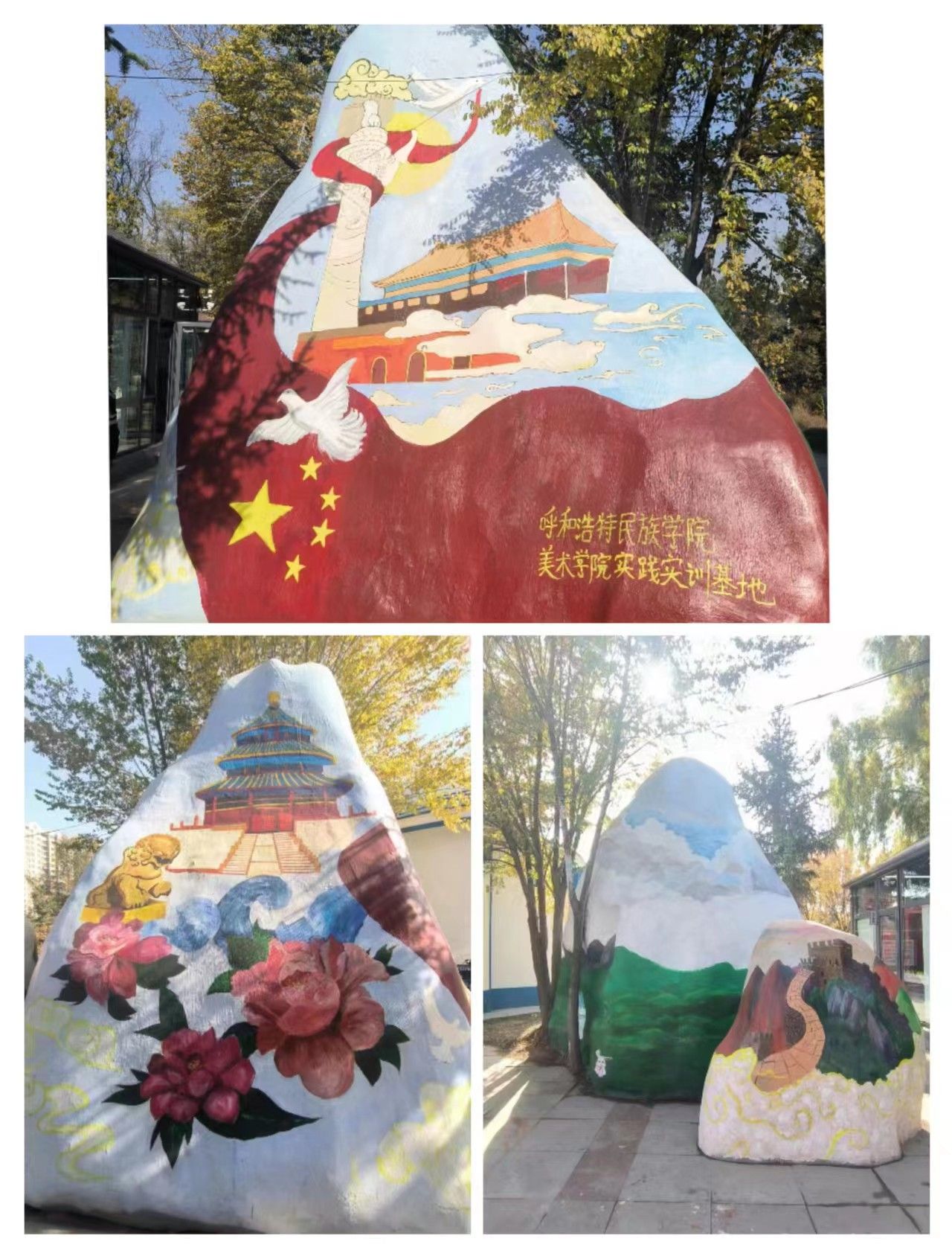 “红石榴”志愿服务主题公园坐落于通道北街和成吉思汗大街交汇处西北角。园内设有同心广场、红石榴造型雕塑、北疆文化长廊等多个宣传载体,其中四面菱形高达六米的中华文化符号景观石的彩绘工作由我院团总支书记魏伟带领党员志愿者服务队累计120余人次,历时15天,累计服务时长2000小时完成。志愿服务队根据内蒙古北疆志愿服务联合会的需求,本着弘扬“奉献、友爱、互助、进步”的志愿服务精神,利用每天课余时间,科学统筹、合理安排,分工明确,提前定稿,做好前期准备工作;开工后又遇暴雨冲刷,重新返工,全力补救,几经艰辛,完美呈现出天安门广场、天坛公园、万里长城等最具代表性的画面。