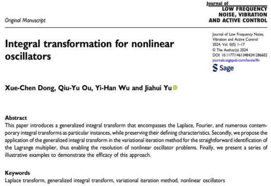 近日,数学与大数据学院数学与应用数学专业2021级本科生董学晨、欧秋宇和吴怡函撰写的学术论文“Integral Transformation for Nonlin-ear Oscillators”在国际学术期刊《Journal of Low Frequency Noise, Vibration and Active Control》上在线发表,论文通讯作者为数学与大数据学院黄大年式教师团队于佳晖博士。