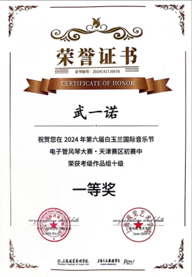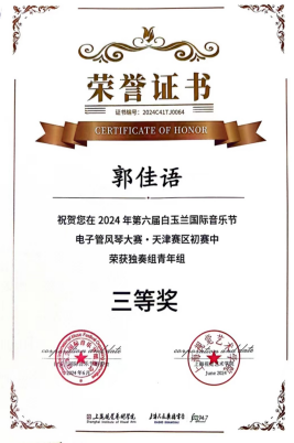 6月8日,2024第六届白玉兰国际音乐节电子键盘乐器(电子管风琴)大赛在天津市青年宫成功举办。best365音乐学院双排键专业学生武一诺在天津赛区初赛中荣获考级作品组(十级)一等奖、学生郭佳语荣获独奏青年(18周岁及以上)组三等奖的优异成绩,并均闯入全国决赛。