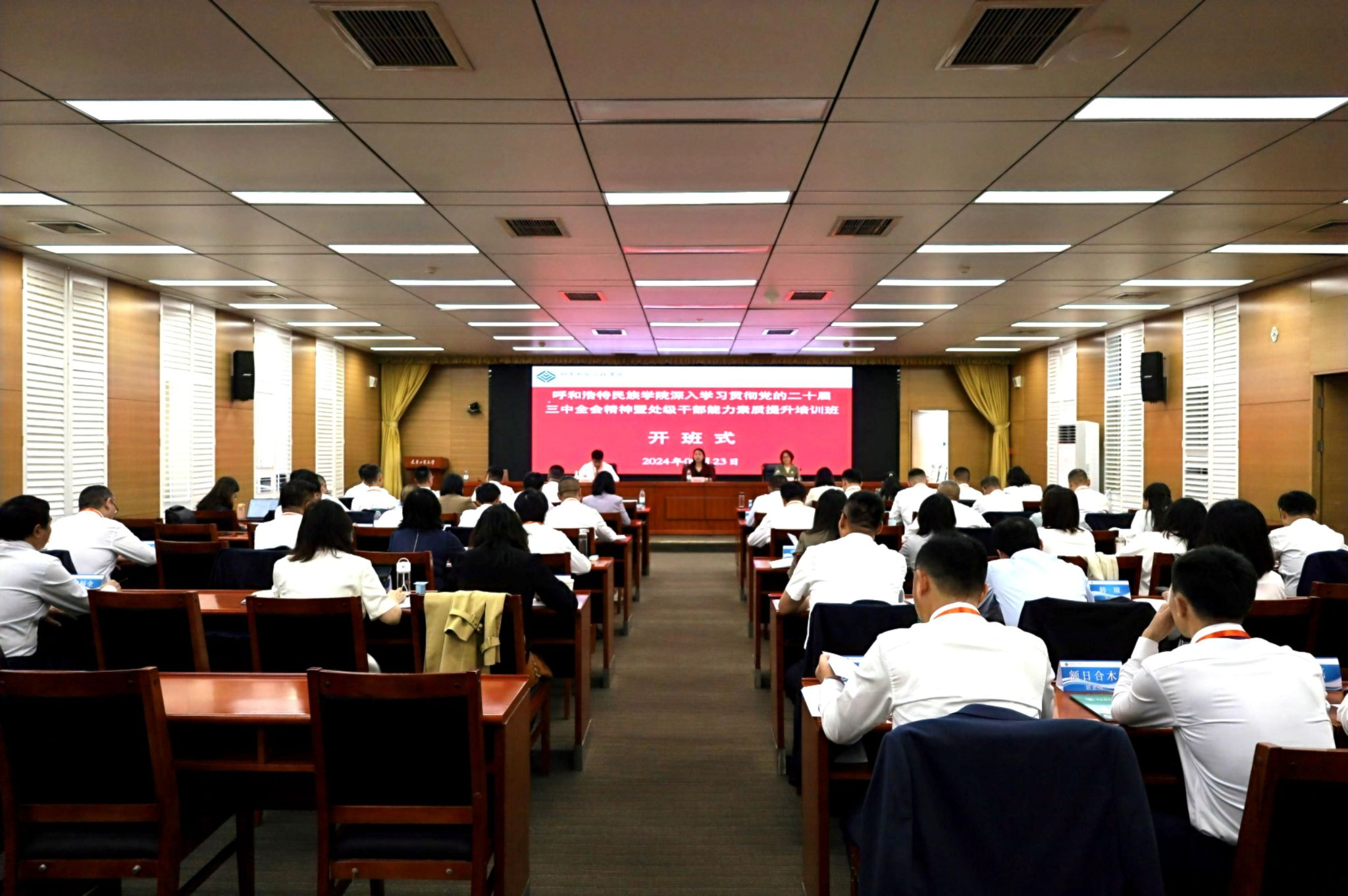在9月23日的开班仪式上,国家教育行政学院高校管理教研部教授许杰致欢迎辞。学校党委副书记格根哈斯作动员讲话,强调全体学员要提升政治站位,准确把握党的二十届三中全会精神的核心内容,坚持以学促干、全面提升推动发展的能力本领,端正学习态度、严肃培训纪律锤炼过硬作风,做到学有所悟、学有所获、学有所成,真正把学习成果转化为推动学校高质量发展的具体行动和实际成效。