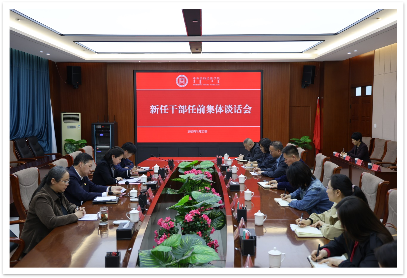 4月23日,学校在综合楼11楼会议室召开了新任处级干部集体谈话会。校党委书记刘九万,党委副书记格根哈斯,党委委员、纪委书记、监察专员王冬梅,党委委员、组织部部长吴阿古拉出席会议。会议由格根哈斯主持。17名平级调整干部、进一步使用处级干部、新提拔处级干部参加会议。